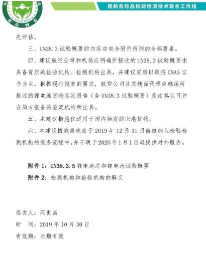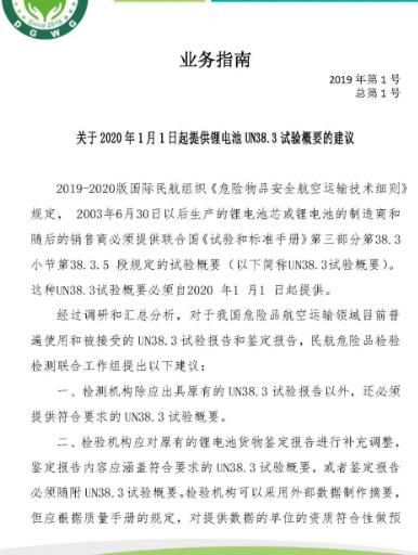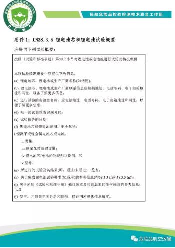 2019-2020版國際民航組織《危險物品安全航空運輸技術(shù)細則》規(guī)定,2003年6月30日以后生產(chǎn)的鋰電池芯或者鋰電池的制造商和隨后的銷售商必須提供聯(lián)合國《試驗和標準手冊》第三部分第38.3小節(jié)第38.3.5段規(guī)定的試驗概要(以下簡稱UN38.3試驗概要)。