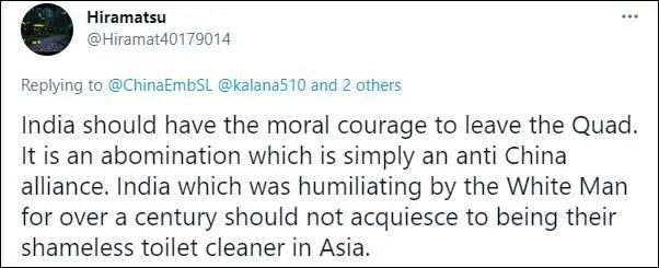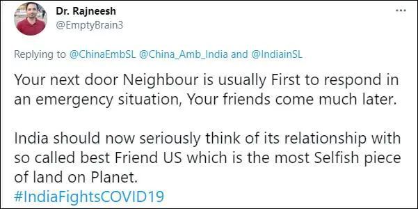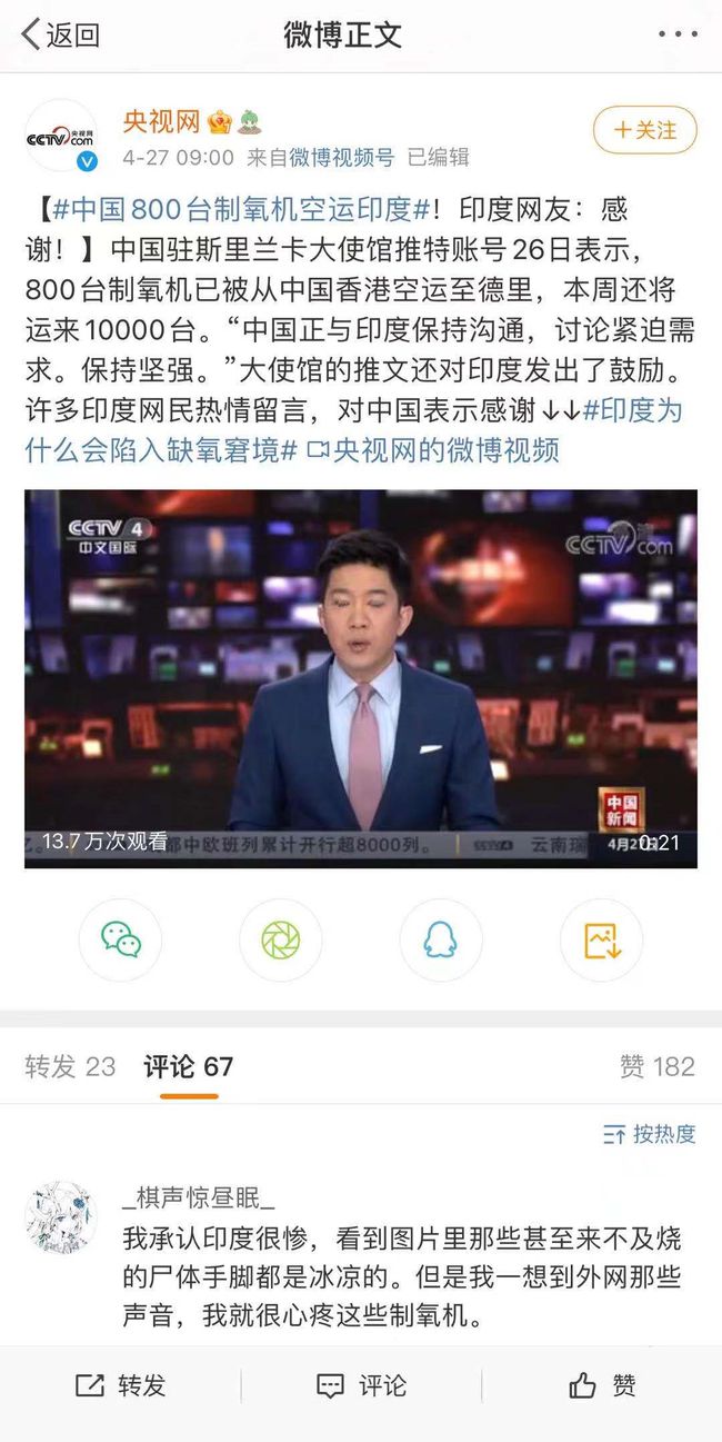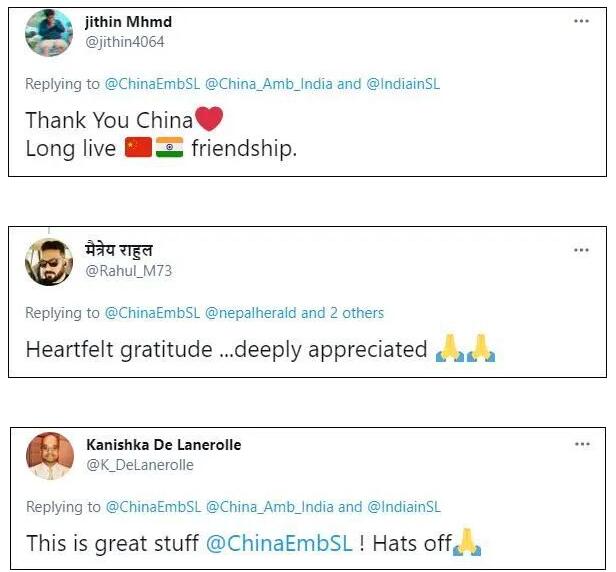 盡管兩人都沒有特別提到制氧機來自中國,但在我駐斯里蘭卡大使館的那條推文下,絕大多數(shù)印度網民熱情留言,對中國表示感謝:“中印友好萬歲”、“發(fā)自內心地感謝”、“向你們脫帽致敬”。
