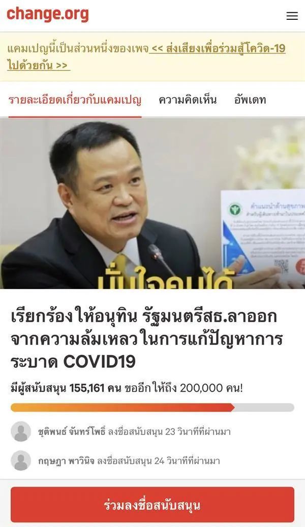 當?shù)貢r間4月25日, 泰國醫(yī)護工作者在網站上發(fā)起簽名活動要求泰國副總理兼衛(wèi)生部長阿努廷辭職 。理由是自泰國新冠疫情暴發(fā)、尤其是今年3月底第三輪疫情暴發(fā)以來,阿努廷未采取足夠應對措施,導致確診病例激增,阿努廷應為此負領導責任。