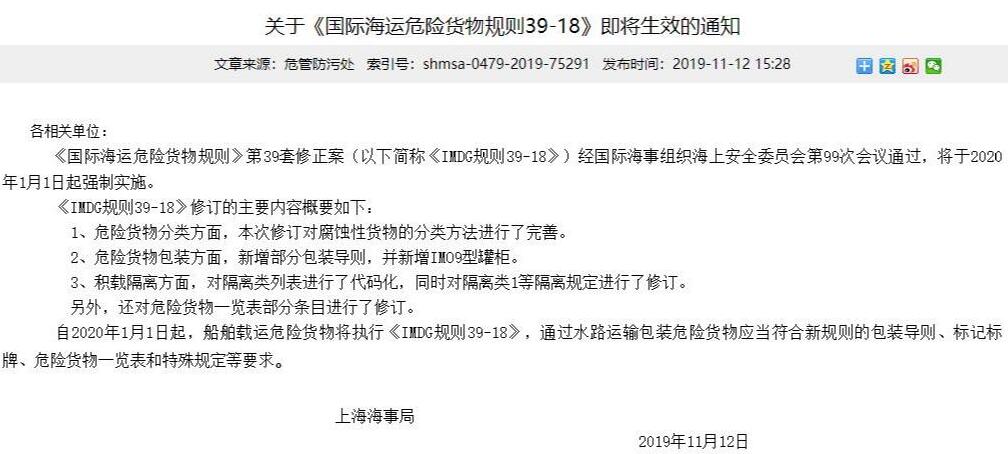 《國際海運危險貨物規(guī)則》第39套修正案(以下簡稱《IMDG規(guī)則39-18》)經(jīng)國際海事組織海上安全委員會第99次會議通過,將于2020年1月1日起強制實施。