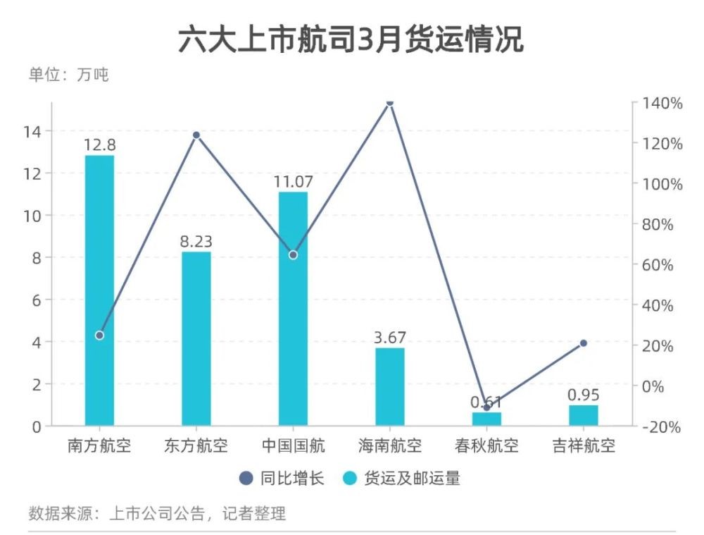 海航控股的貨運量雖然不高,但其增速最大,同比增長139.65%,同時也是貨郵載運率唯一一個正向增長的航司,增長8.51個百分點。